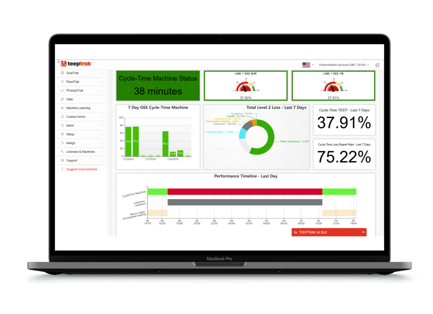 Contrairement à un simple “compteur TRS”, TEEPTRAK combine données machines + saisies opérateurs pour donner le contexte des pertes (causes d’arrêts, rebuts, vitesses, dérives process).